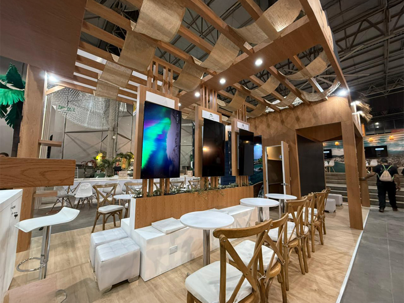 Durante el proceso de fabricación del stand, se cuidó cada detalle constructivo, seleccionando materiales, acabados e iluminación que evocaran frescura, calidez y autenticidad. La integración de la gráfica y los elementos visuales reforzó el mensaje de destino, generando un alto impacto dentro del entorno ferial.